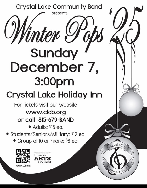 The Crystal Lake Community Band will be performing Winter Pops on Sunday, December 7, 2025 at the Crystal Lake Holiday Inn, located at 800 South IL Route 31, Crystal Lake, IL